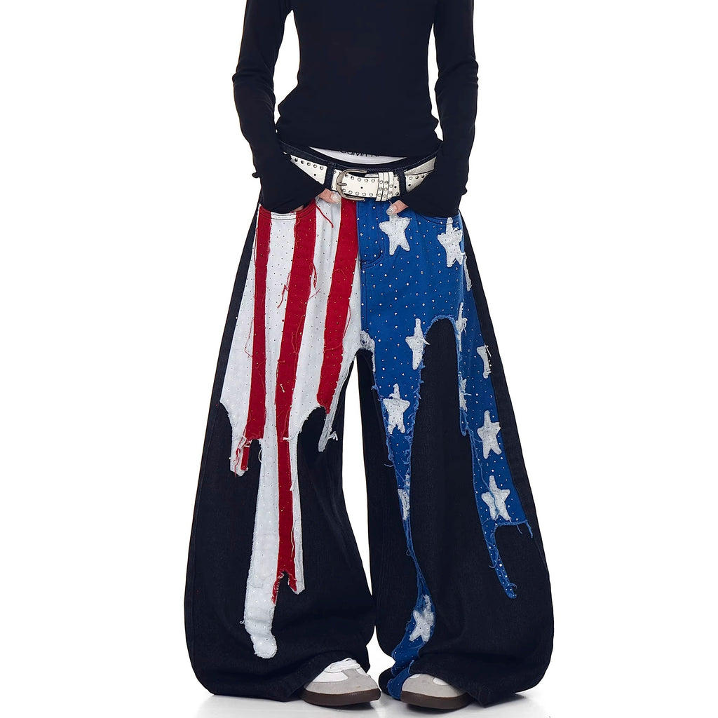 Fflag Patch Rhinestone Wide Curve Jeans BK7066