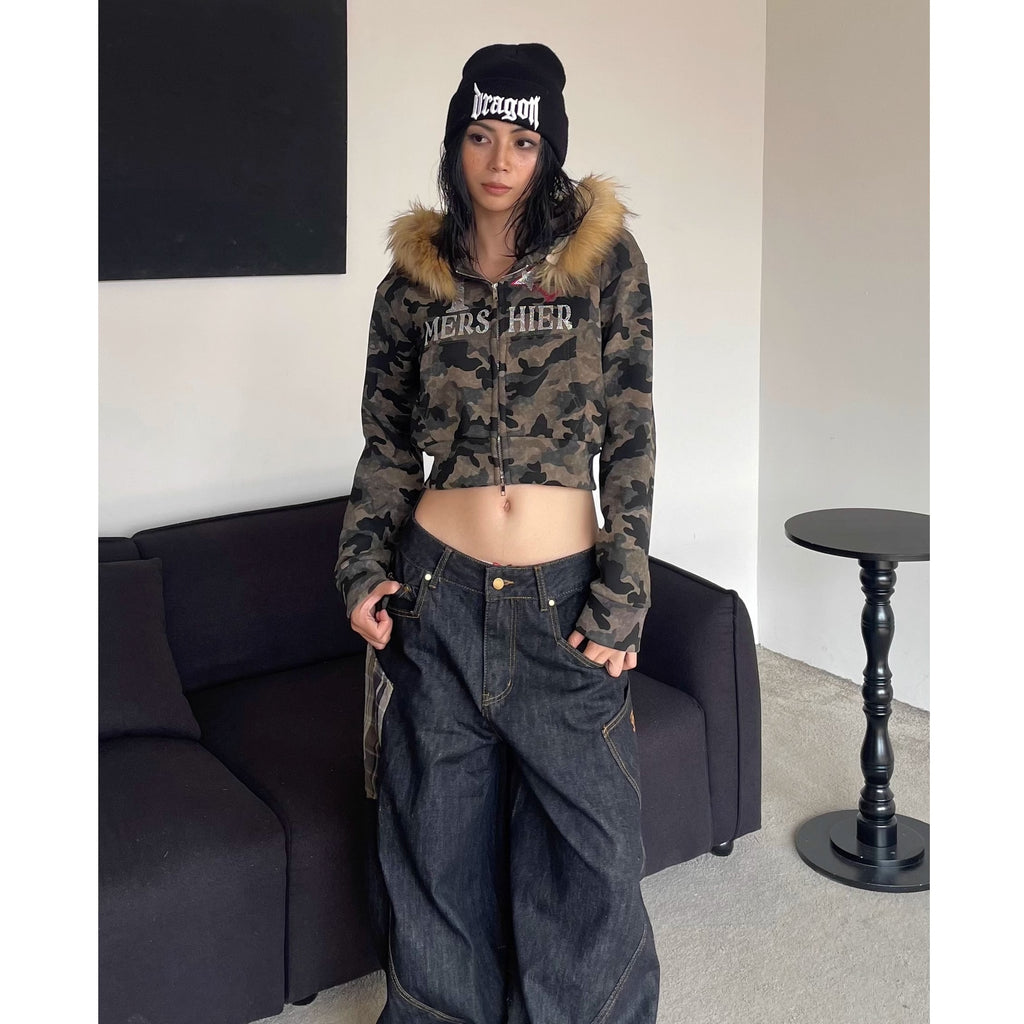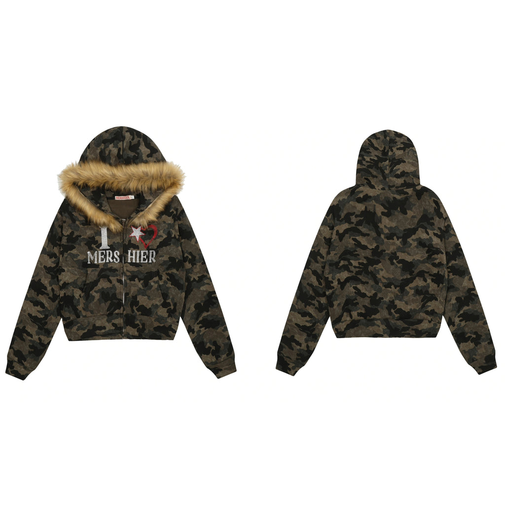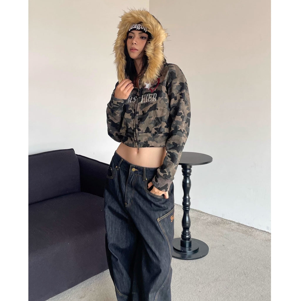 Fur Collar Camouflage Rhinestone Cropped Hoodie Parka MW10302